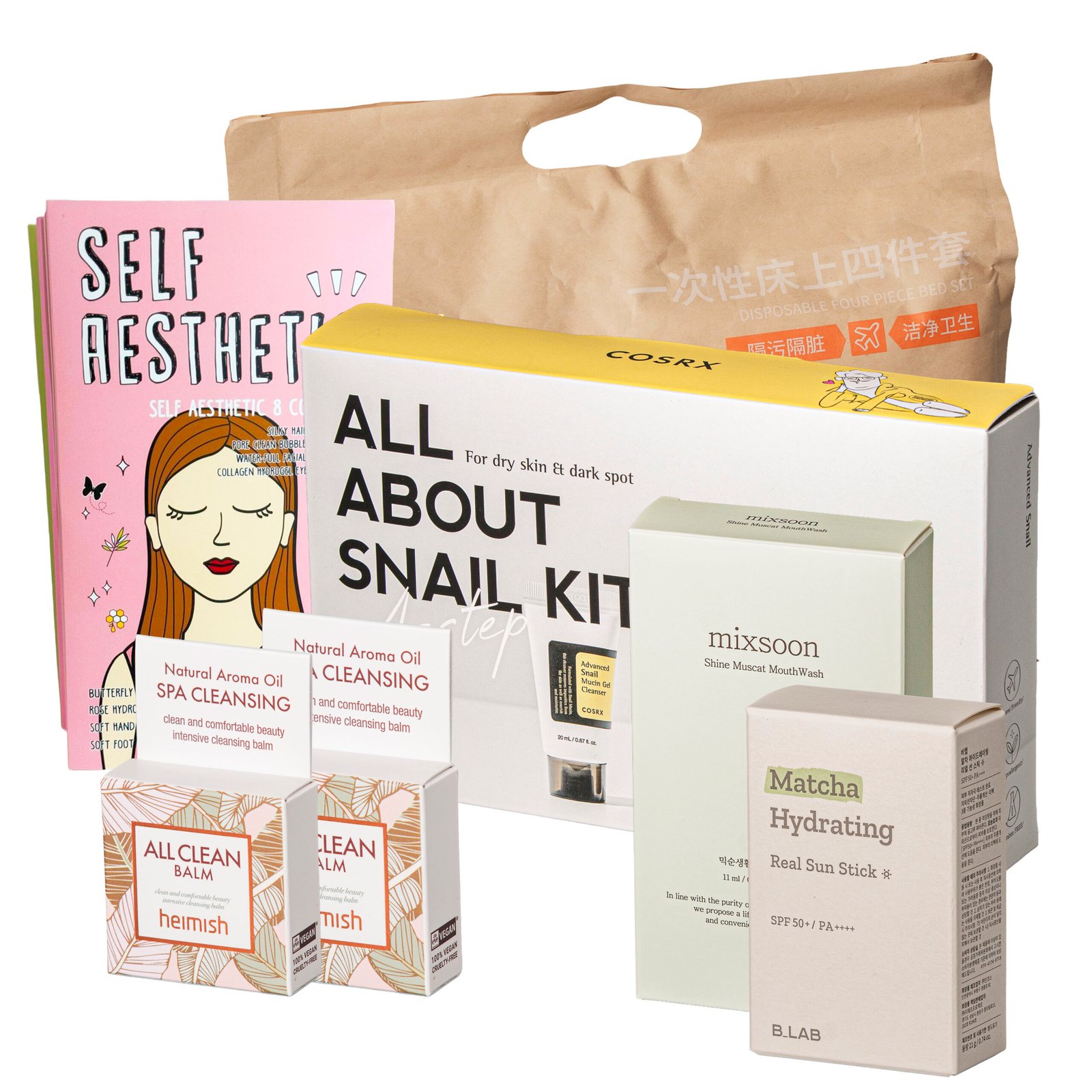 - COSRX – All About Snail Kit (Advanced Snail Mucin Gel Cleanser 20ml, Advanced Snail 96 Mucin Power Essence 30ml, Advanced Snail Peptide Eye Cream 5ml, Advanced Snail 92 All-In-One Cream 20g)